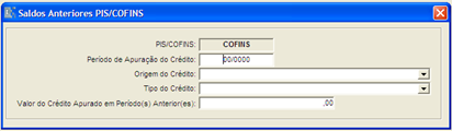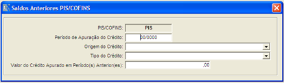 Menu: Contabilidade > Módulo Fiscal > Saldos Anteriores PIS / COFINS.