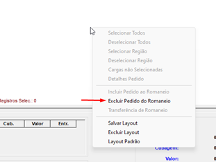 E em seguida, sem a necessidade de filtrar, deve clicar com o botão direito ou em processos em “Excluir Pedidos do Romaneio”