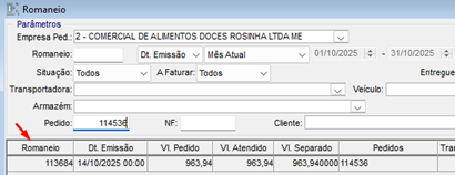 Ou na tela do romaneio (faturamento>expedição>romaneio) filtrando pelo o número do pedido.