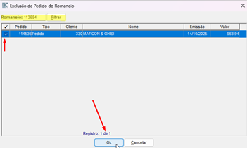 Com o romaneio filtrado, você deve selecionar os pedidos que deseja realizar a exclusão e em seguida clicar em ok.