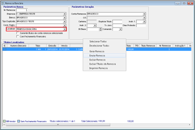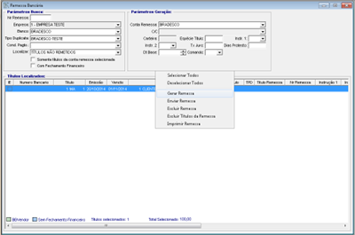 Preencher os filtros, informando o banco, tipo de duplicata e conta remessa. Pressione F8 para carregar os títulos de acordo com os dados preenchidos. Selecionar os títulos e clicar com o botão direito do mouse, selecionando a opção “Gerar Remessa”.