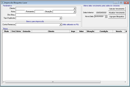 Menu: Faturamento > Impressões > Impessão Bloquetos Laser. Realizar a busca do boleto através dos filtros da tela de impressão: