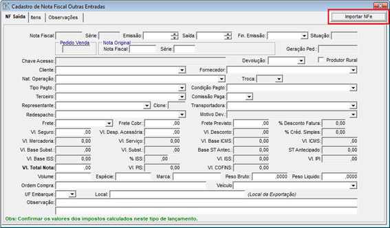 Menu: Faturamento > Nota Fiscal > Nota Fiscal Outras Entradas. Através do botão “Importar NFe” será possível importar os dados do XML a ser selecionado.