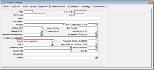 Menu: Estoque > Produto. No cadastro do produto, informar o tipo de espécie como “Ativo Imobilizado”.