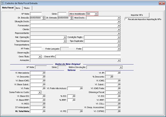 Menu: Materiais > Recebimento > Nota Fiscal Entrada. Ao realizar o lançamento destes produtos no sistema, informar “Sim” no campo Ativo Imobilizado e preencher os demais campos normalmente.