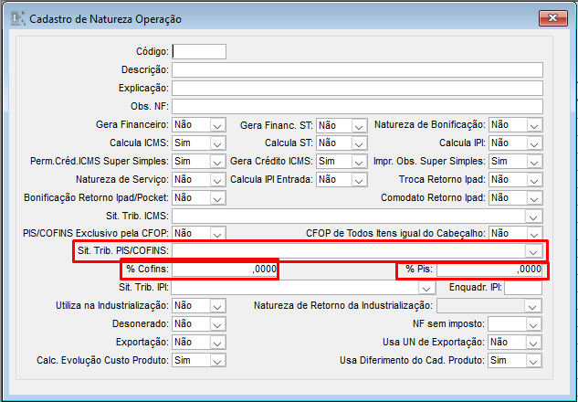 Informar se recupera PIS/COFINS por venda e deixar em branco o campo “Situação Tributária PIS/COFINS venda”, assim o sistema irá verificar de acordo com o cadastro da natureza de operação.