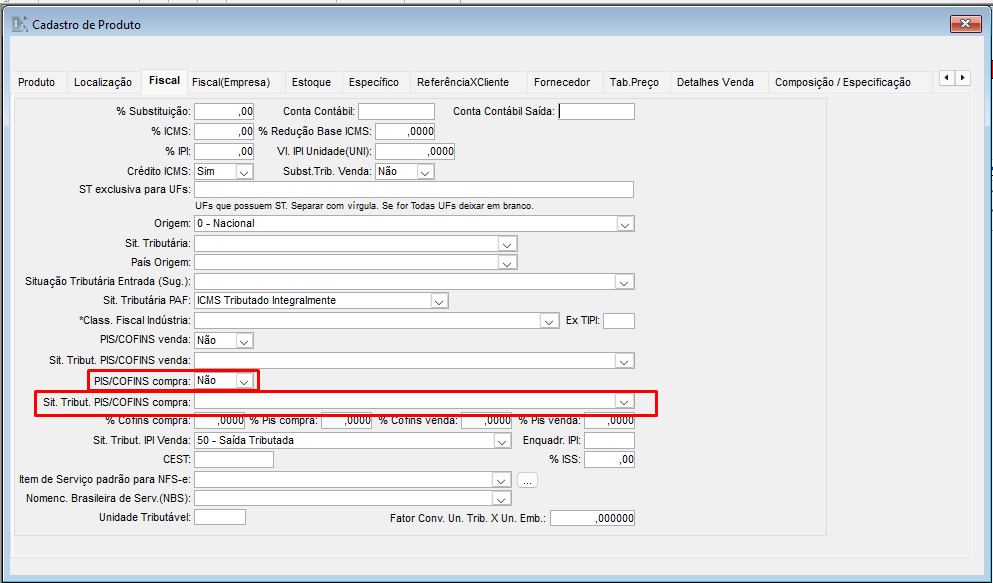 Preencher o campo “Situação Tributária PIS/COFINS” e informar os percentuais de PIS/COFINS.