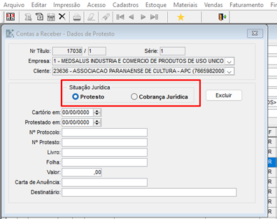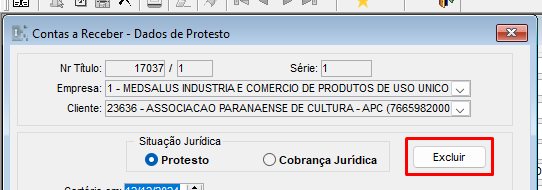 Na tela Contas a Receber – Dados de Protesto você deve clicar em excluir e em seguida salvar.