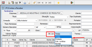 Na tela de Financeiro > Contas a Receber , o filtro “Situação Jurídica” deve ser selecionado a situação jurídica de acordo com a necessidade.