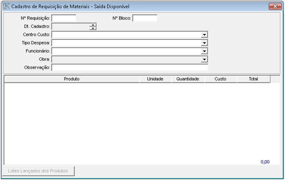 Para emissão da requisição, o usuário deverá acessar através do menu: Estoque > Requisição – Saída Disponível. Clicar em “Novo” para realizar o cadastro, preenchendo os seguintes campos: