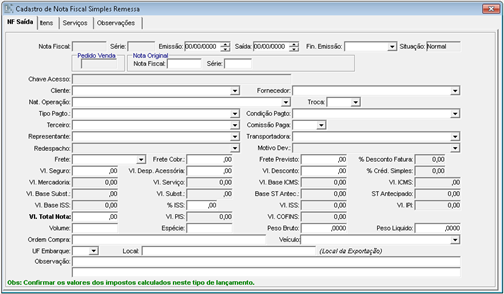 No cabeçalho da nota, além dos campos comuns a serem preenchidos, tais como: cliente/fornecedor; natureza de operação; etc., nas informações sobre valores, somente o campo “Vl. ICMS” será preenchido, ao qual o sistema informará automaticamente de acordo com o produto. No campo “Observação”, referenciar a nota ao mês/ano e operação (obs.: a contabilidade poderá orientar como preencher a observação corretamente).
